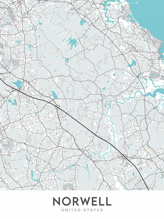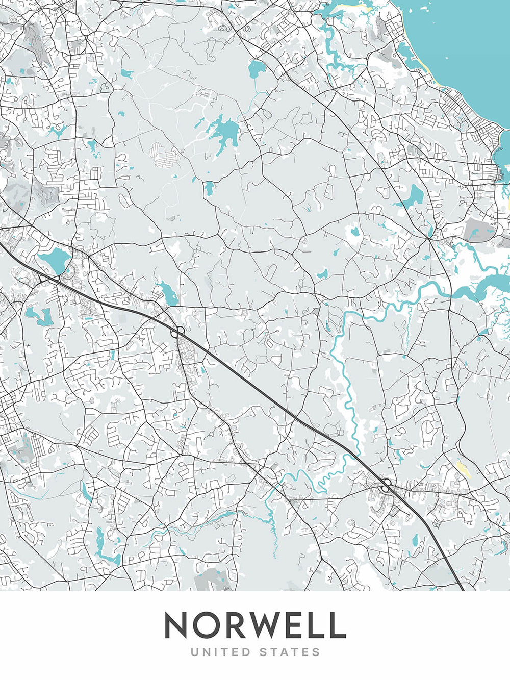This original creation by The Unique Maps Co. features unique cartography, modern design, and a striking color palette. The map is a beautiful work of art that will complement any home or office. It is a great conversation starter and a perfect way to learn more about the city of Norwell.