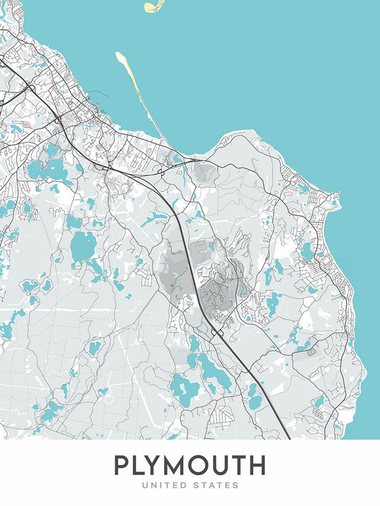 This map of Plymouth, Massachusetts, is a modern, detailed street map without labels. It focuses on the city center and the surrounding areas, providing an accurate and visually appealing representation of the city. The map covers a significant portion of Plymouth, including several neighborhoods, towns, major roads, routes, highways, and landmarks.