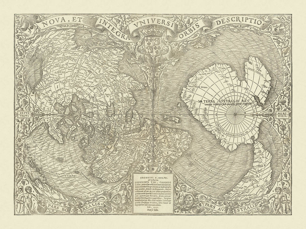 Aesthetically, Fine’s map is a triumph of Renaissance artistry. The detailed woodcut is framed by a lush floral border, flanked by two mermaids and muscular cherubs that evoke the mythic and the maritime. The French royal coat of arms is displayed with pride, while a flowing banner at the top proclaims the map’s title. The lower cartouche bears Fine’s own name, marking this as the coveted first state of the map—a rare and desirable feature for collectors and connoisseurs. Every element, from the ornate border to the meticulously engraved landmasses, reflects the humanist ideals and decorative sensibilities of its time.