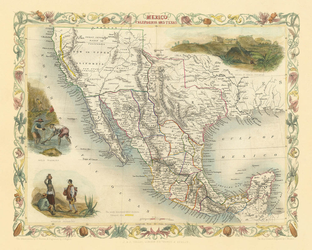 Old Map of Mexico, California & Texas by Tallis, 1851: Gold Rush, Texas Republic, Yucatan, Rio Grande, Pre-Gadsden Border