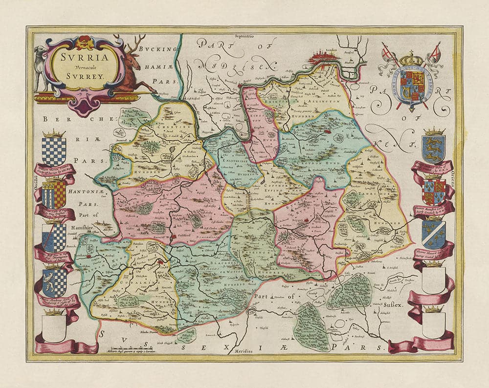 Old Map of Surrey in 1665 by Joan Blaeu: Woking, Guildford, Croydon, Richmond, Kingston, Reigate