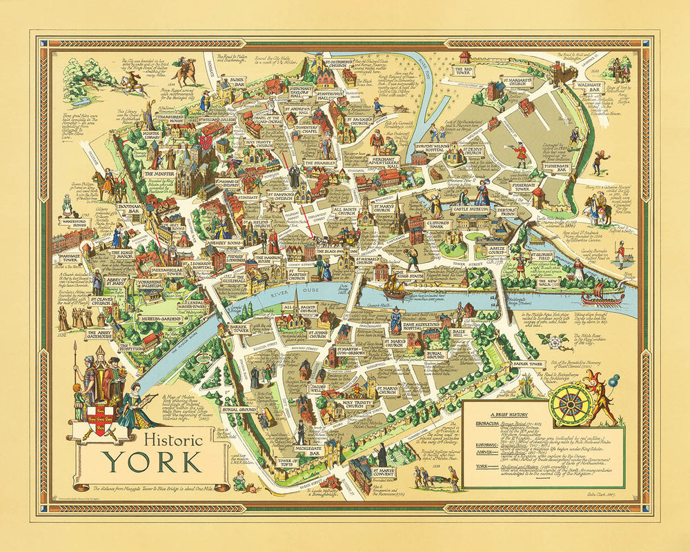 Old Pictorial Map of York by Clark 1947: York Minster, Clifford's Tower, Shambles, Monk Bar, Jorvik