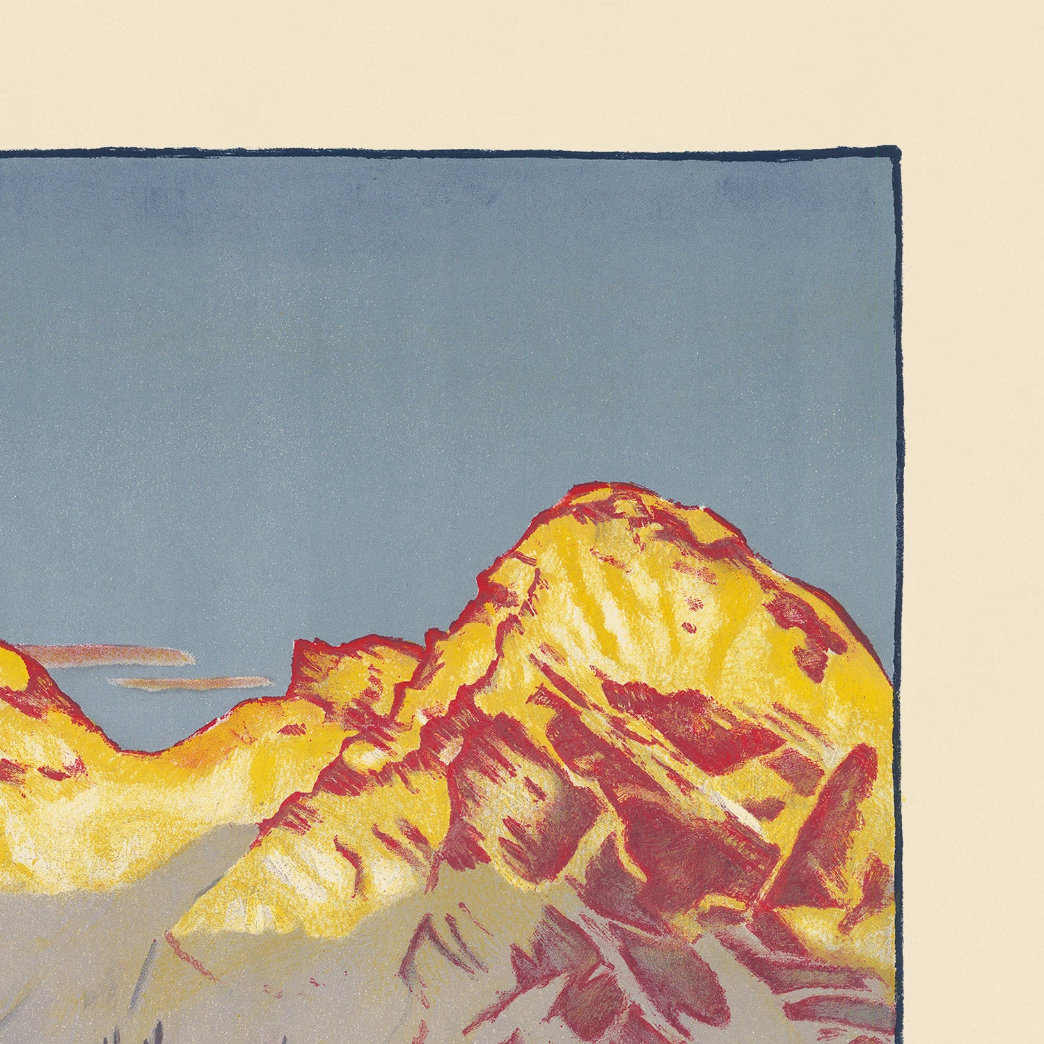 Visually, it’s a masterclass in alpine minimalism. The dominant blue of the lake and sky is counterbalanced by crisp areas of white suggesting snow and sun‑dazzled slopes, while yellow accents—especially the “Chur‑Arosa Bahn” lettering—provide a warm, inviting contrast. The high contrast and flattened planes give the piece a timeless, graphic quality that reads beautifully in contemporary interiors. The composition leads the eye from foreground to horizon, evoking the sensation of ascending toward light, height, and clean air—ideal for anyone who loves the mountains or the romance of classic rail travel.