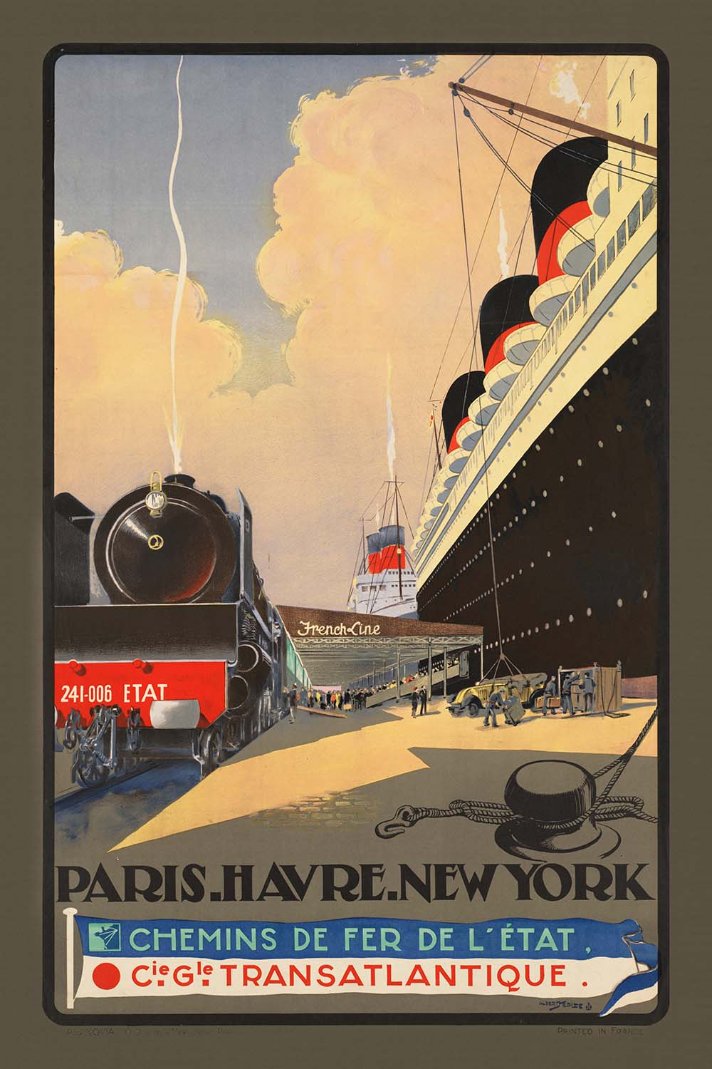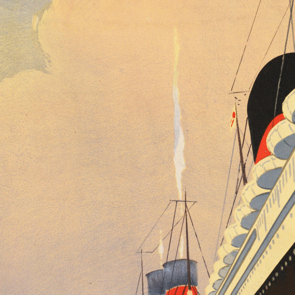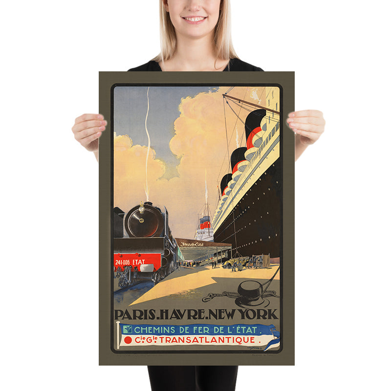 This poster’s subject is historically significant: it advertises a coordinated rail-and-sea itinerary that linked the cultural heart of Paris with the deep-water port of Le Havre and the skyscraper silhouette of New York. At a time when steam power shrank oceans and timetables promised certainty, such routes symbolized international exchange, new opportunities, and the magnetic pull of two world capitals. Displaying this print brings that spirit of global connection—France to America, continent to continent—into the home.