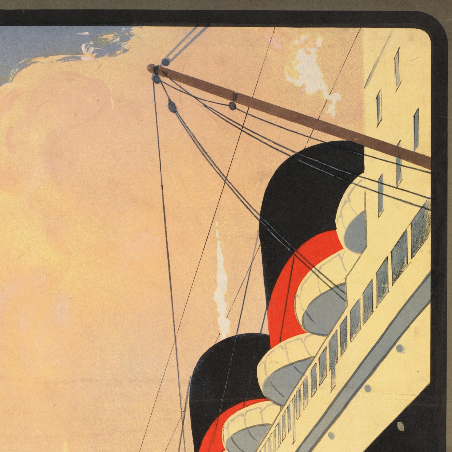 Sébille’s Art Deco styling heightens the sense of speed and luxury. Angular lines and streamlined curves sweep the eye from a sleek locomotive to a towering liner, while repeating circular motifs on the ship’s deck echo portholes and instrument dials. A refined palette of warm beige grounds the composition, with inky blacks carving out silhouette and shadow and confident reds adding urgency and focus. Crisp outlines and smooth tonal gradients create a polished, modern look—perfect for interiors that lean contemporary, industrial, or vintage-chic. It’s a striking conversation piece for anyone drawn to maritime history, railway design, or the golden age of travel.
