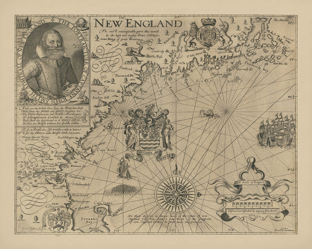 First Map of New England by John Smith, 1616: Boston, Plymouth, Cape Ann, Ornate Baroque Design