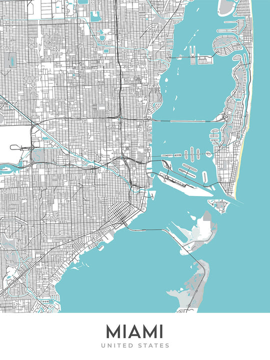 This map of Miami, Florida, is a modern, detailed street map that focuses on the city's vibrant neighborhoods, iconic landmarks, and scenic waterways. The map covers a rectangular area that encompasses the city's most popular tourist destinations, including South Beach, Coconut Grove, and Downtown Miami. It also includes nearby towns such as Coral Gables, Key Biscayne, and Hialeah.