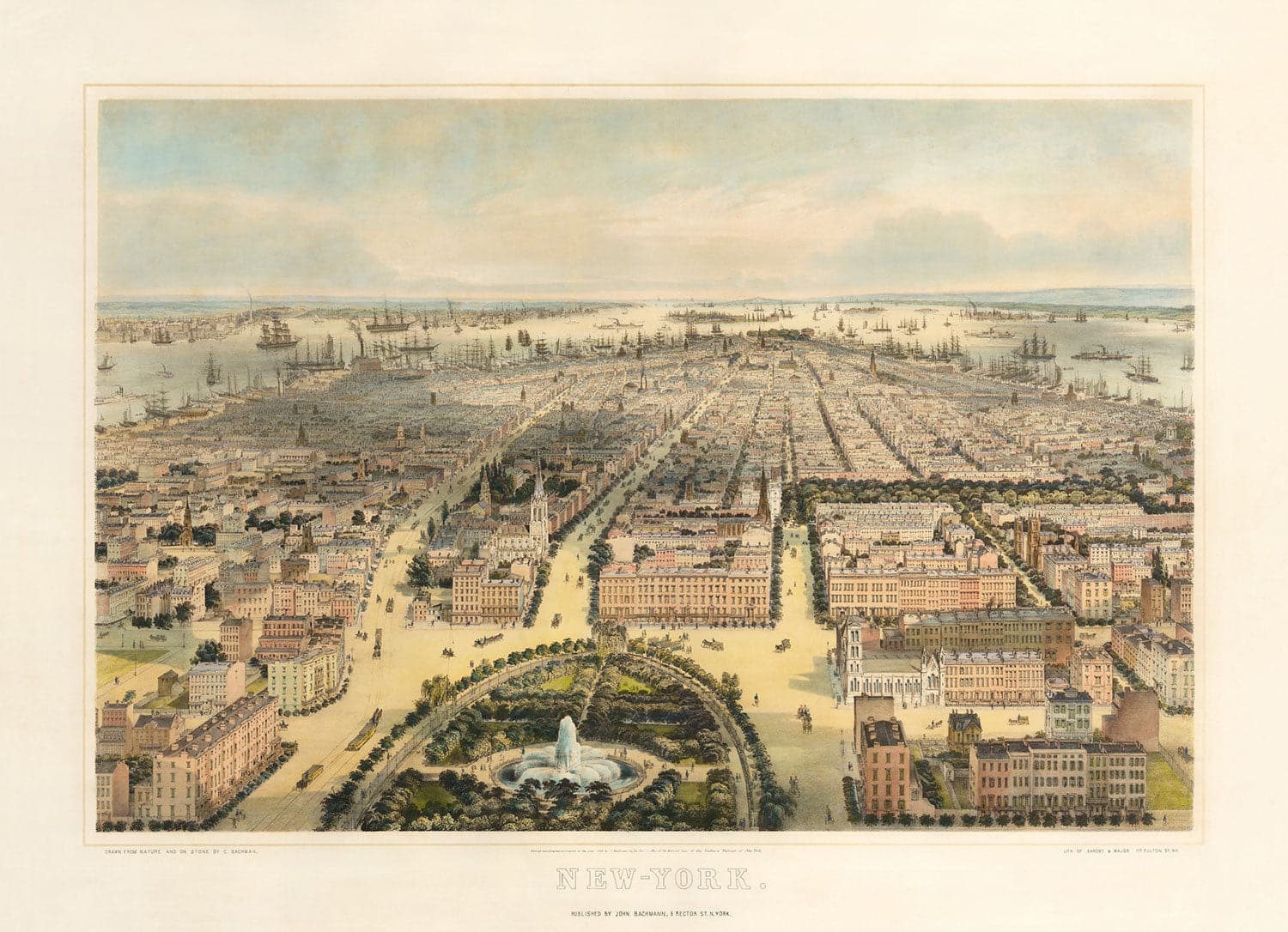 Old Birds Eye Map of New York in 1849: Lower Manhattan, Soho, Noho, Union Square, Broadway, Battery Park, Ellis Island