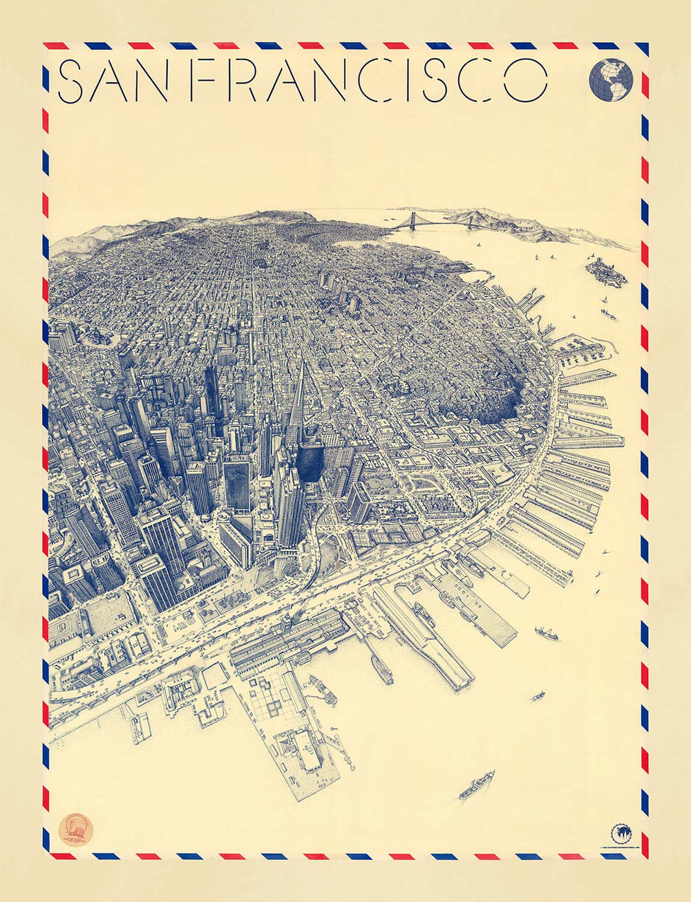 Old Birds Eye Map of San Francisco in 1982: Skyscrapers, Bay Area, Golden Gate Bridge, Financial District, Nob Hill