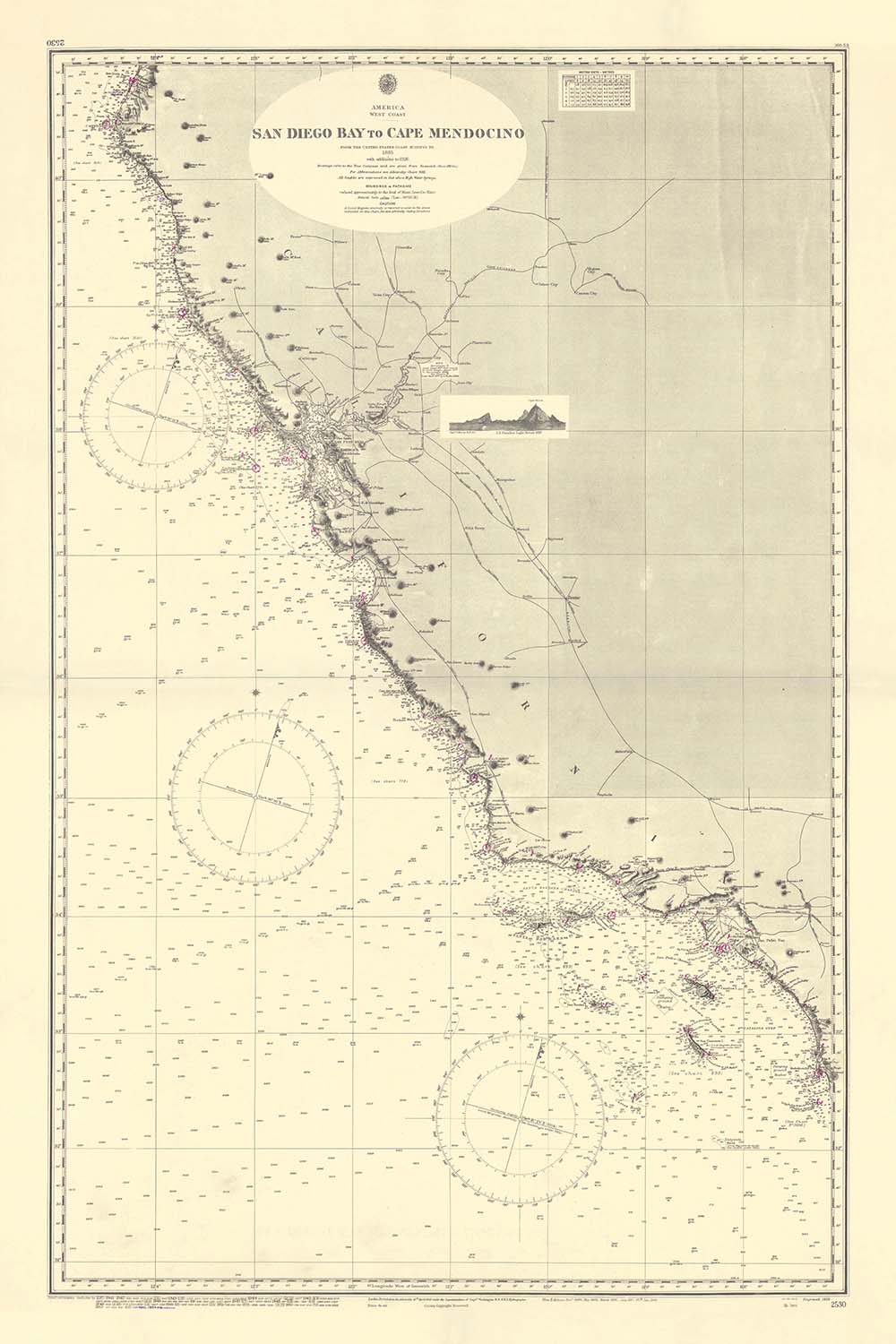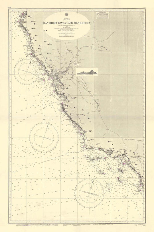 Discover the captivating allure of maritime history with our exquisite nautical chart, "America - West Coast - San Diego Bay to Cape Mendocino." This meticulously crafted map, created by the renowned Admiralty in 1955, offers a fascinating glimpse into the navigational practices of the mid-20th century. Covering the stunning coastline from San Diego Bay to Cape Mendocino, this chart is an essential piece for any collector or enthusiast of maritime exploration.