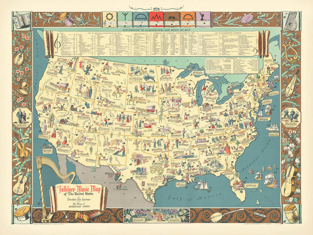 Old Folk Music Map of United States by Lawrence, 1946: Zuni Symbols, Bayou Ballads, Musical Themes