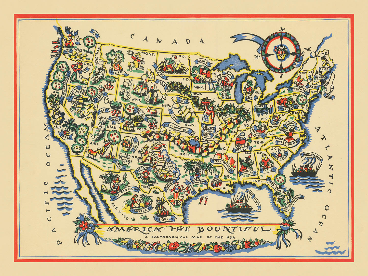 Old Gastronomical Map of the USA, 1939: Great Wheat Belt, Corn Belt, Agriculture, etc.