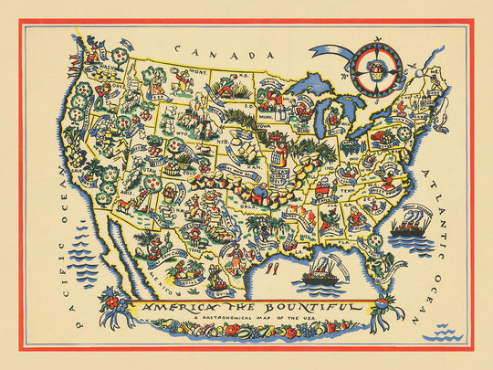 Step into the whimsical world of American gastronomy with "America The Bountiful: A Gastronomical Map of the U.S.A.," a rare pictorial treasure crafted in 1939 by an anonymous artist. This map is a vibrant celebration of the United States’ culinary landscape on the eve of World War II, capturing the nation’s agricultural abundance and regional food identities with a playful, yet meticulously detailed, hand. Each state is adorned with charming illustrations of its most iconic foods—apples for the Northeast, corn for the Midwest, chili con carne for the Southwest—offering a delightful, visual feast that invites both nostalgia and discovery.