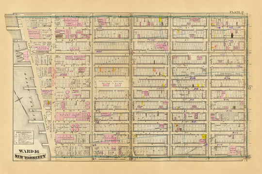 This exquisite 1879 hand-colored lithograph represents Ward 16 of New York City, covering the Chelsea neighborhood. The map was crafted by the esteemed cartographer G.W. Bromley, known for his detailed urban cartographic works. The map is detailed, showcasing the meticulous urban planning of the era, with block dimensions, water mains, and even fire hydrants clearly marked. One can appreciate the precision in delineating the original water courses and farm lines, as well as the ward boundaries that defined the city's administrative divisions at the time.