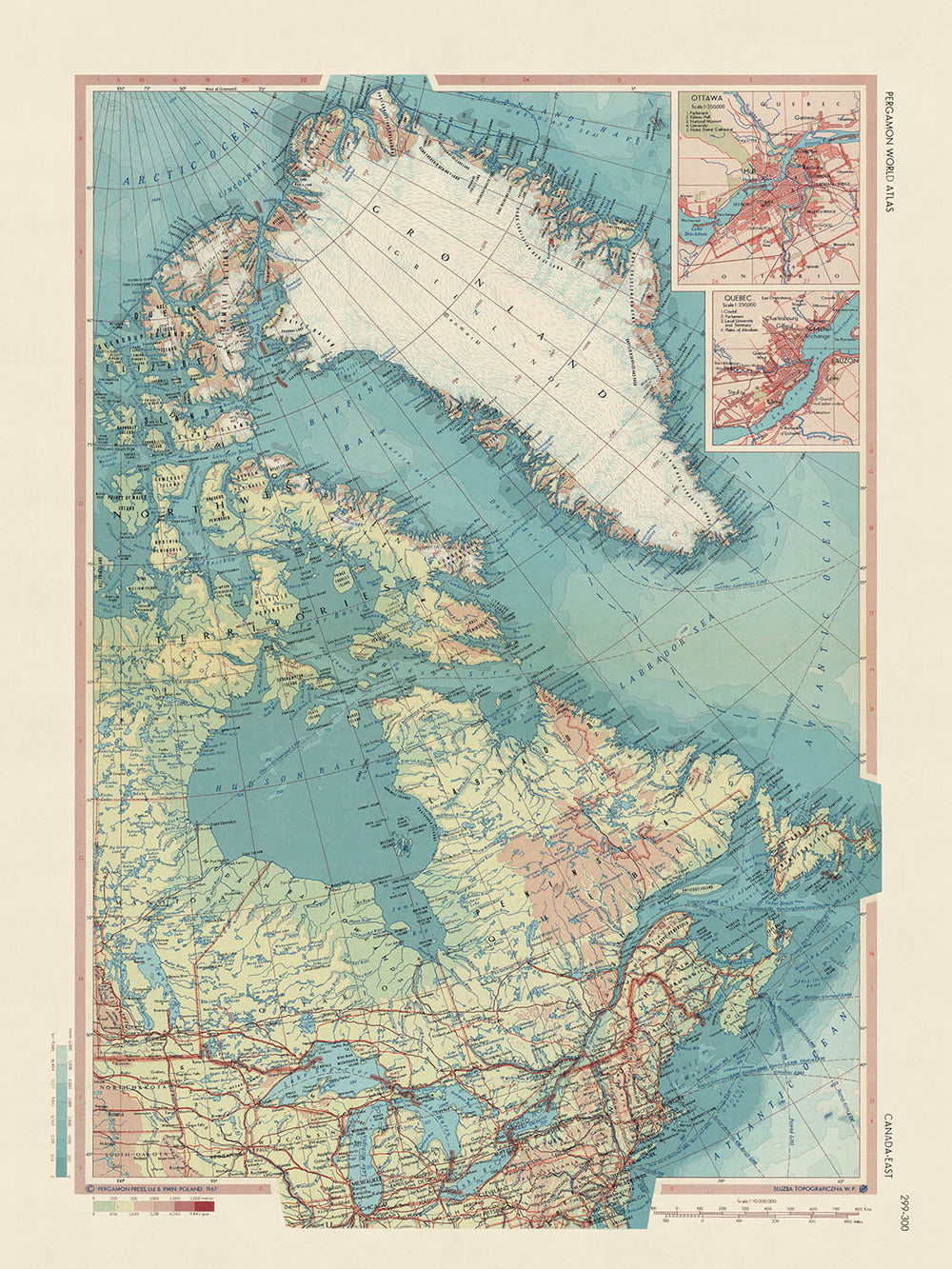 Old Map of Eastern Canada, 1967: Ontario, Greenland, Newfoundland, Labrador, Detailed Political & Physical Atlas