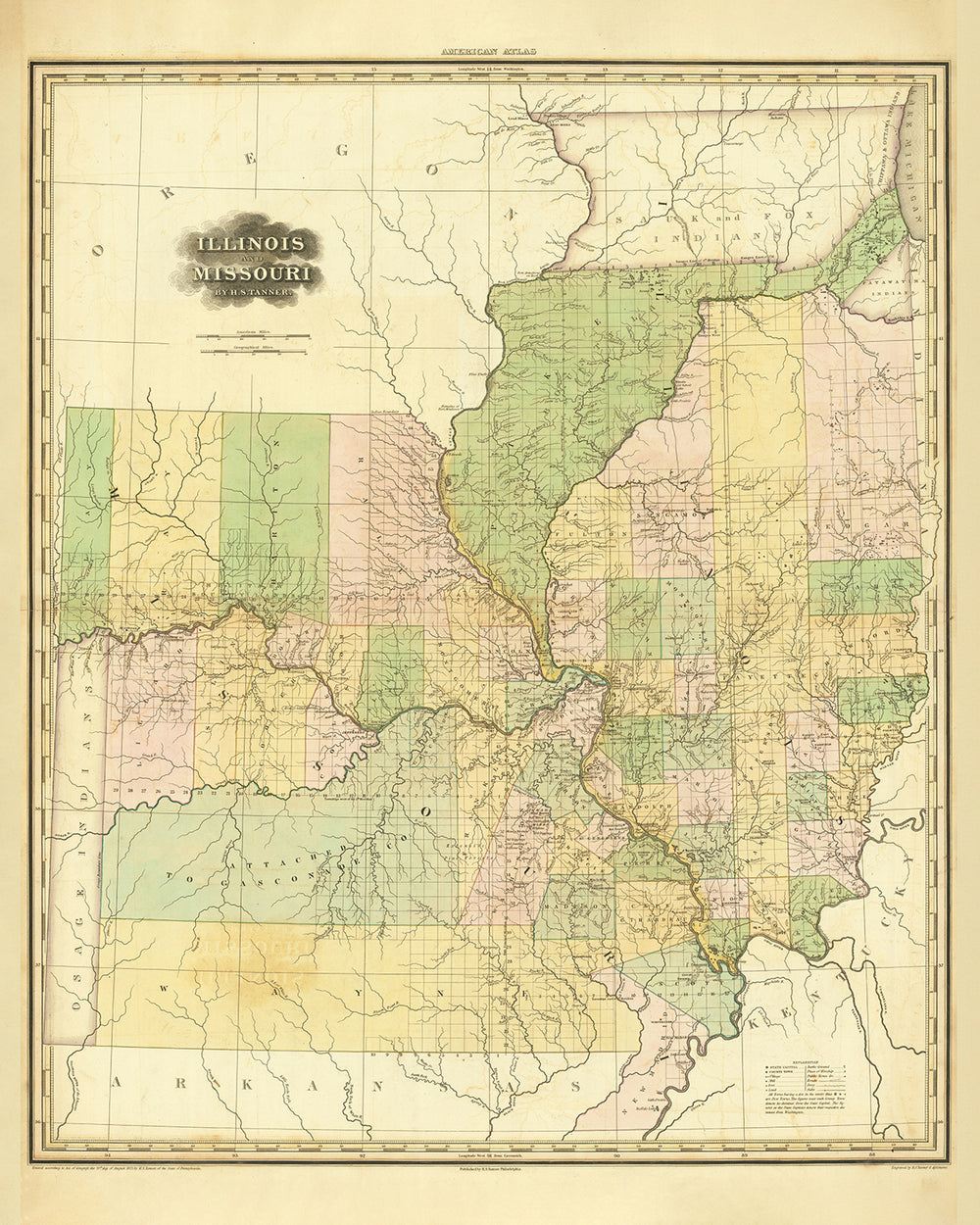 Old Map of Illinois and Missouri by H. S. Tanner, 1820: Chicago, Springfield, Peoria, Columbia, and St. Louis