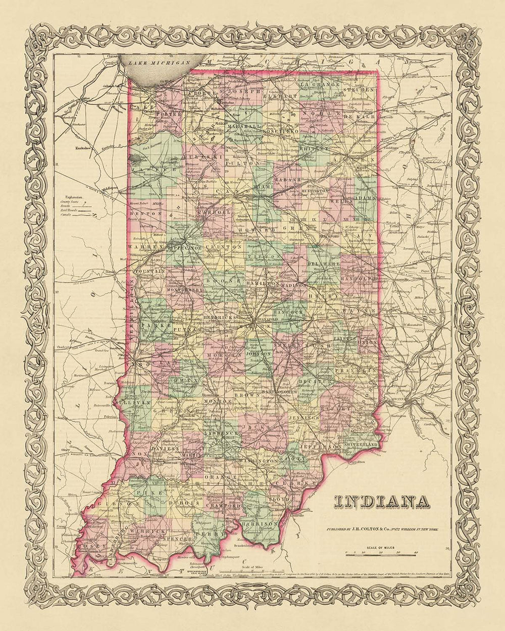 The work of J.H. Colton, widely regarded as the finest American mapmaker of his era, is characterized by his exceptional attention to detail and accuracy. This map is no exception. It features the five most notable settlements in Indiana at the time: Indianapolis, the state capital and a key hub of commerce and transportation; Fort Wayne, a vital outpost on the frontier; New Albany, a thriving river town; Terre Haute, known for its rich natural resources; and Lafayette, a bustling center of trade and industry.