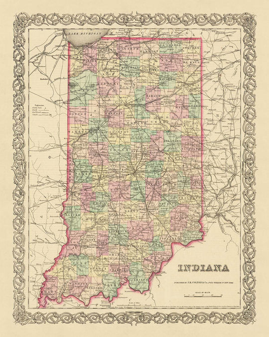 Immerse yourself in the rich history of the United States with this exquisite old map of Indiana, crafted by the renowned mapmaker J.H. Colton in 1855. This piece offers a fascinating glimpse into the early development of the nation, a time when many settlements were yet to be founded and the landscape was in a constant state of flux. As you trace the delicate lines and intricate details of this map, you'll be transported back to a time when the country was still finding its feet and carving out its identity.