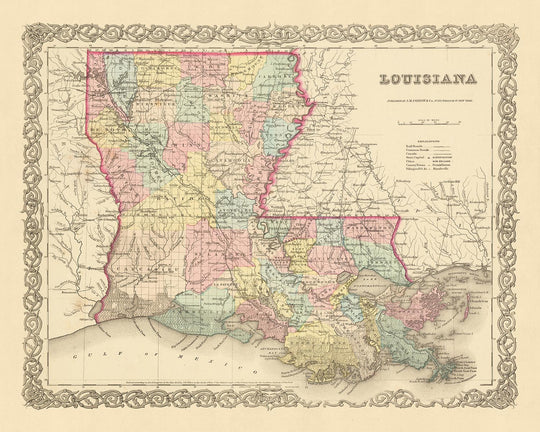 Experience the thrill of discovery as you navigate the intricate details of this map, uncovering the stories of Louisiana's past. Whether you're a seasoned collector or simply a lover of history, this old map of Louisiana by J.H. Colton is sure to captivate and inspire. It's more than just a map - it's a journey into the past, a tangible connection to the history of the United States.