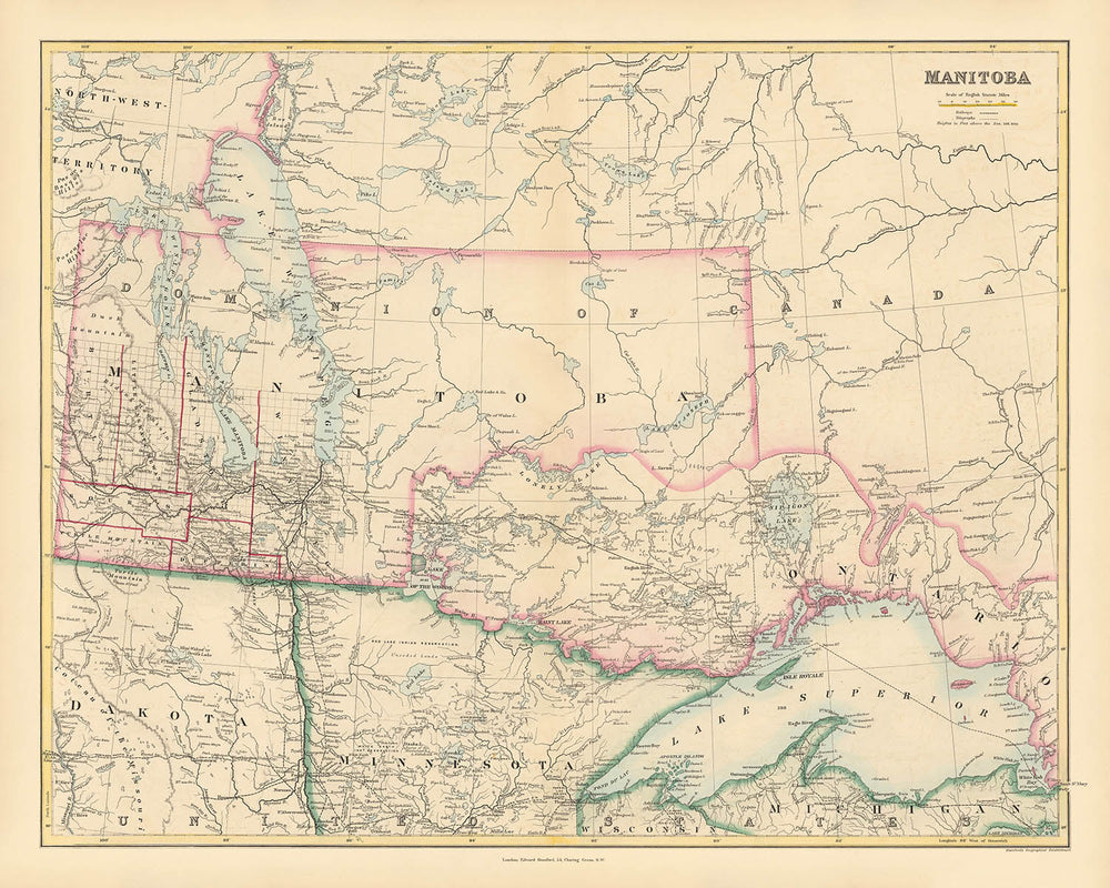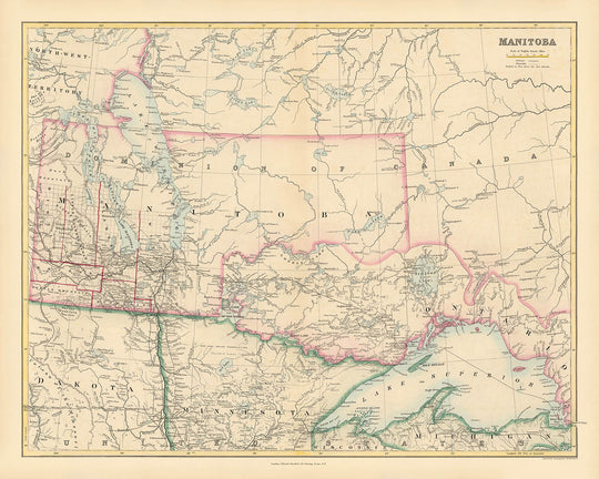 Immerse yourself in the rich history of the Canadian landscape with the "Map of Manitoba" crafted by the esteemed cartographer John Arrowsmith in 1884. This exquisite map is a testament to Arrowsmith's unparalleled skill and dedication to detail, showcasing the Dominion of Manitoba in a period of significant growth and development. The map is part of Stanford's London Atlas of Universal Geography, a prestigious collection that captures the physical and political divisions of the world during the 19th century. Each administrative division is meticulously outlined, offering a glimpse into the past and the intricate tapestry of Manitoba's burgeoning settlements and transportation networks.