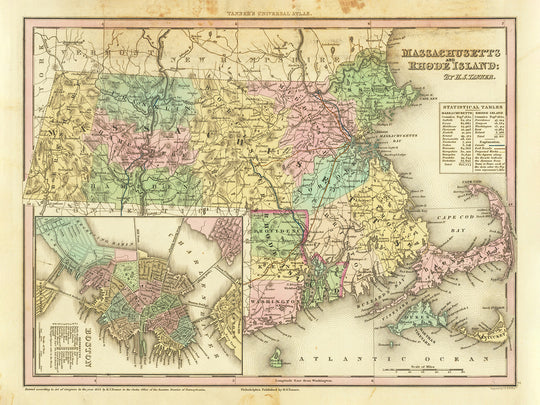 Embark on a captivating historical journey with this high-end, meticulously crafted 1836 map of Massachusetts and Rhode Island by renowned cartographer H. S. Tanner. This beautiful piece captures an era before many major modern cities even existed or when they were known by different names, offering a rare insight into the past. The map remarkably details the geography and boundaries of the region, along with charmingly accurate renderings of towns, cities, and settlements established before 1820. An attractive inset, providing a detailed view of Boston, further enhances the map’s overall allure.