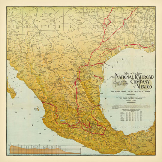 Step back in time with the "Map of the Lines of the National Railroad Company of Mexico," a captivating piece crafted in 1903 by the renowned Poole Brothers and the American Bank Note Company. This map elegantly captures the burgeoning rail networks that once connected the vibrant landscapes of Mexico and Texas. Known as "The Scenic Short Line to the City of Mexico," it offers a unique glimpse into the transportation marvels of the early 20th century, highlighting the vital economic and cultural links between these regions.