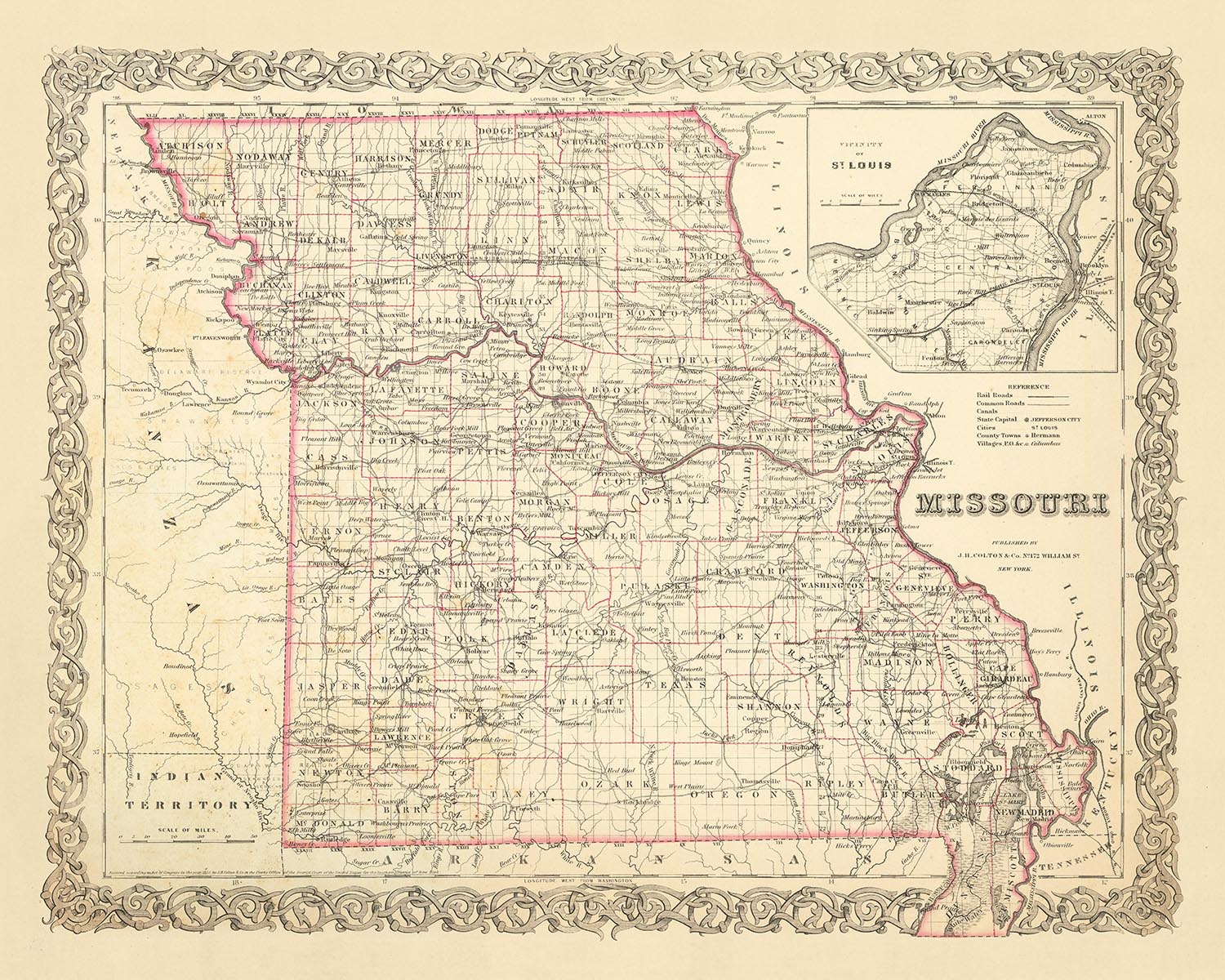 Immerse yourself in the fascinating past of the United States with this captivating old map of Missouri, meticulously crafted by the esteemed mapmaker J. H. Colton in 1860. This piece offers a unique glimpse into a formative period in American history, a time when the nation was still in its infancy and the landscape of Missouri was markedly different from what we know today. It's an extraordinary testament to the relentless march of time, a reminder of how far we've come and how much has changed in the last 150 years.