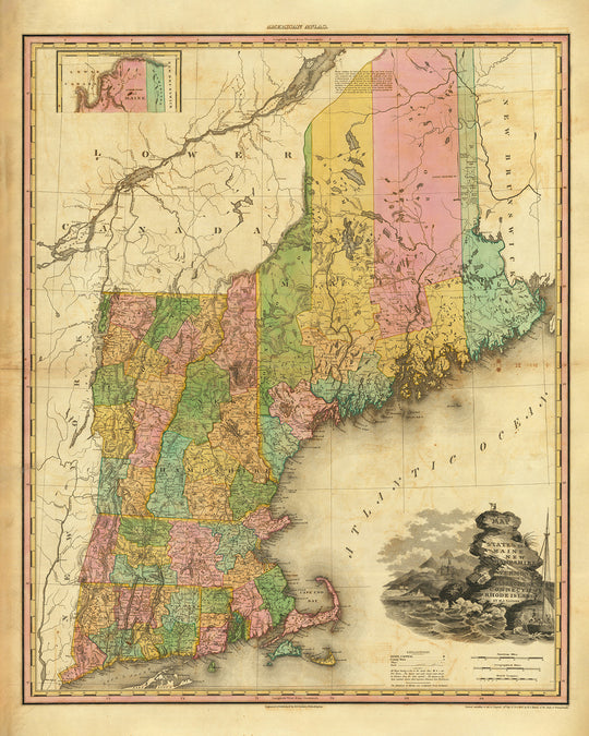 Immerse yourself in the historical tapestry of New England with this exquisite reproduction of the "Old Map of New England" by H. S. Tanner. Explore the detailed settlements, counties, landmarks, and natural wonders that shaped the region in 1820. This map serves as both a captivating piece of history and a stunning display of cartographic artistry, making it an invaluable addition to any collection or a thoughtful gift for history enthusiasts, map lovers, and anyone fascinated by the rich heritage of New England.