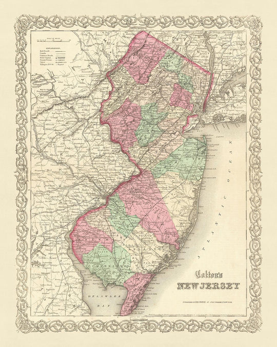 Immerse yourself in the rich history of the United States with this exquisite 1855 map of New Jersey, crafted by the renowned mapmaker J. H. Colton. This piece is a testament to the early days of American cartography, capturing the Garden State in a time when many of its settlements were still in their infancy. The map showcases the meticulous craftsmanship and attention to detail that have solidified Colton's reputation as one of the finest American mapmakers of his era.