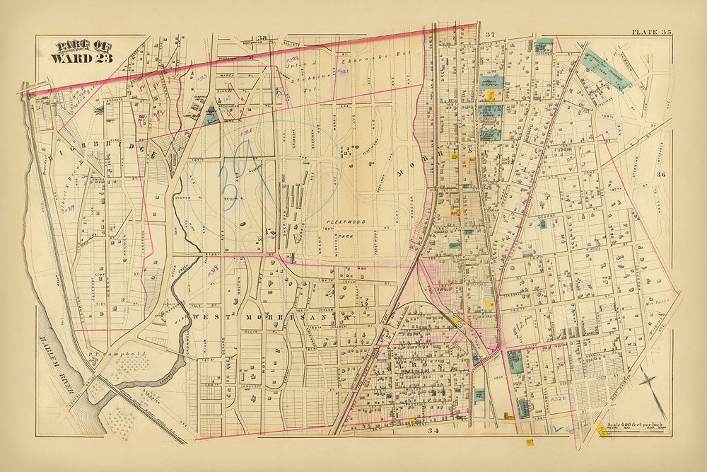 One of the notable features of this map is its detailed representation of significant neighborhoods such as Highbridge, West Morrisania, and Melrose. These areas, rich in history and development, are intricately mapped out, providing insight into the layout and growth of New York City during this period. The inclusion of original farm lines and block dimensions further enhances the map's historical value, offering a unique perspective on the city's transformation from rural to urban landscapes.