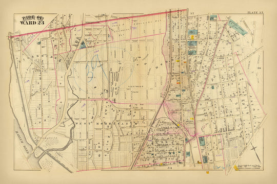 Introducing the exquisite "Part of ward 23, New York City," a hand-colored lithographed map created by the esteemed cartographer G.W. Bromley in 1879. This map offers a fascinating glimpse into the urban fabric of New York City during the late 19th century, showcasing the intricate details of buildings, fire hydrants, steam and street railways, original water courses, and ward boundaries. Bromley's meticulous craftsmanship is evident in the precise depiction of infrastructure and urban planning, making this map a valuable piece for historians and collectors alike.