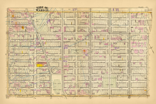 This meticulously detailed map, hand colored and lithographed, was published by G.W. Bromley in 1879, providing a historic snapshot of New York City's Ward 18. At that time, the map would have been an essential tool for city officials, residents, and businesses alike, offering insights into the urban landscape, from building footprints to the locations of fire hydrants and water mains. Its depiction of streets, railways, and public squares not only reflects the physical space but also the vibrancy of 19th-century city life in New York.