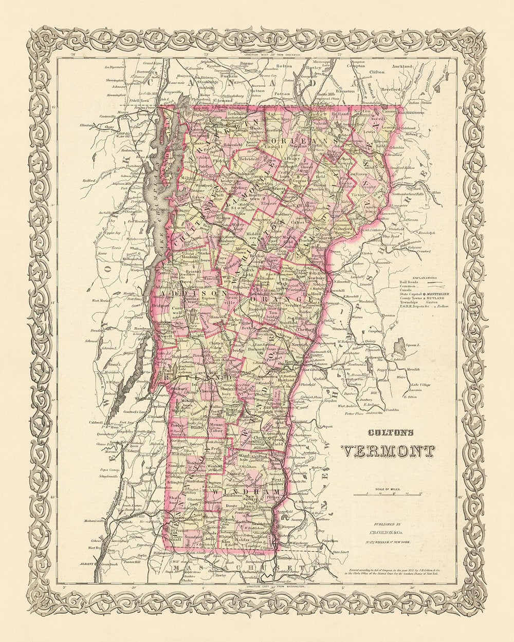 This exquisite piece of cartographic history is an old map of Vermont, created in 1855 by J.H. Colton, a renowned figure in the world of mapmaking. Known for his meticulous attention to detail and accuracy, Colton's work provides a unique window into the past, offering an unparalleled view of Vermont as it was in the mid-19th century.