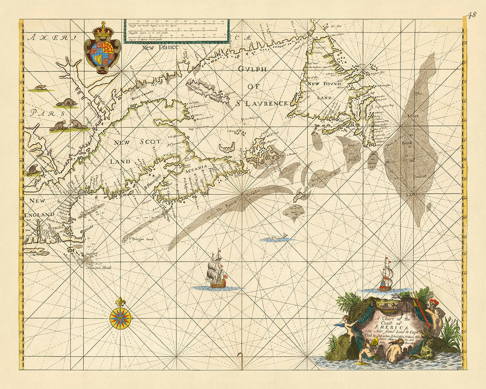 Old Naval Chart from Cape Cod to Newfoundland by Seller, 1674: New England, Nova Scotia, Avalon Peninsula