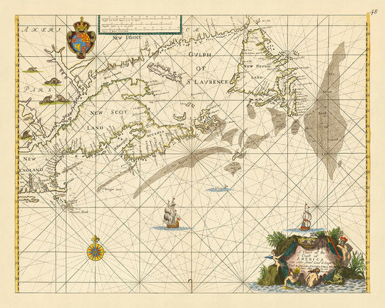 The map's style is characteristic of the naval charts of the era, combining aesthetic appeal with practical utility. The chart closely follows the outline of the landmark map of Dutch chartmaker Joannes van Loon, but with significant improvements and new information. For instance, the map includes St John Isle (or Prince Edward Island), which was missed by Van Loon and not replaced by any other cartographer to date. It also improves the depiction of the Avalon peninsula in Newfoundland with the English knowledge learned through John Mason. The R. Sauguenay and Les Trois Riviere are both prominently inserted in detail, extending the area of coverage westwards to take in the English settlement in New England.