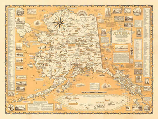 The left and right sides of the map includes grid references to help you locate the towns, villages and landmarks of Alaska. The map is also filled with illustrations of animals (such as the polar bear and musk ox), buildings and famous landmarks. Cities such as Anchorage, Fairbanks, Juneau and Tanana are also visible on this map.