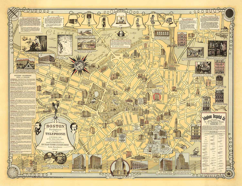 Old Pictorial Map of Boston, 1947 Ernest Dudley Chase: Birth of the Telephone, Graham Bell, Beacon Hill, Downtown