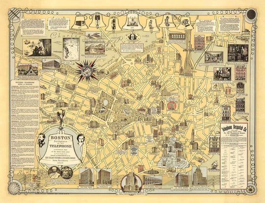 The map is oriented with Charles River to the top and top left of the map, and Atlantic Ave and the waterfront to the right, showing most of central and downtown Boston.This map focuses on Boston as the 'birthplace of the telephone' by Alexander Graham Bell and Thomas Watson. There are dozens of phone-related illustrations around the map.