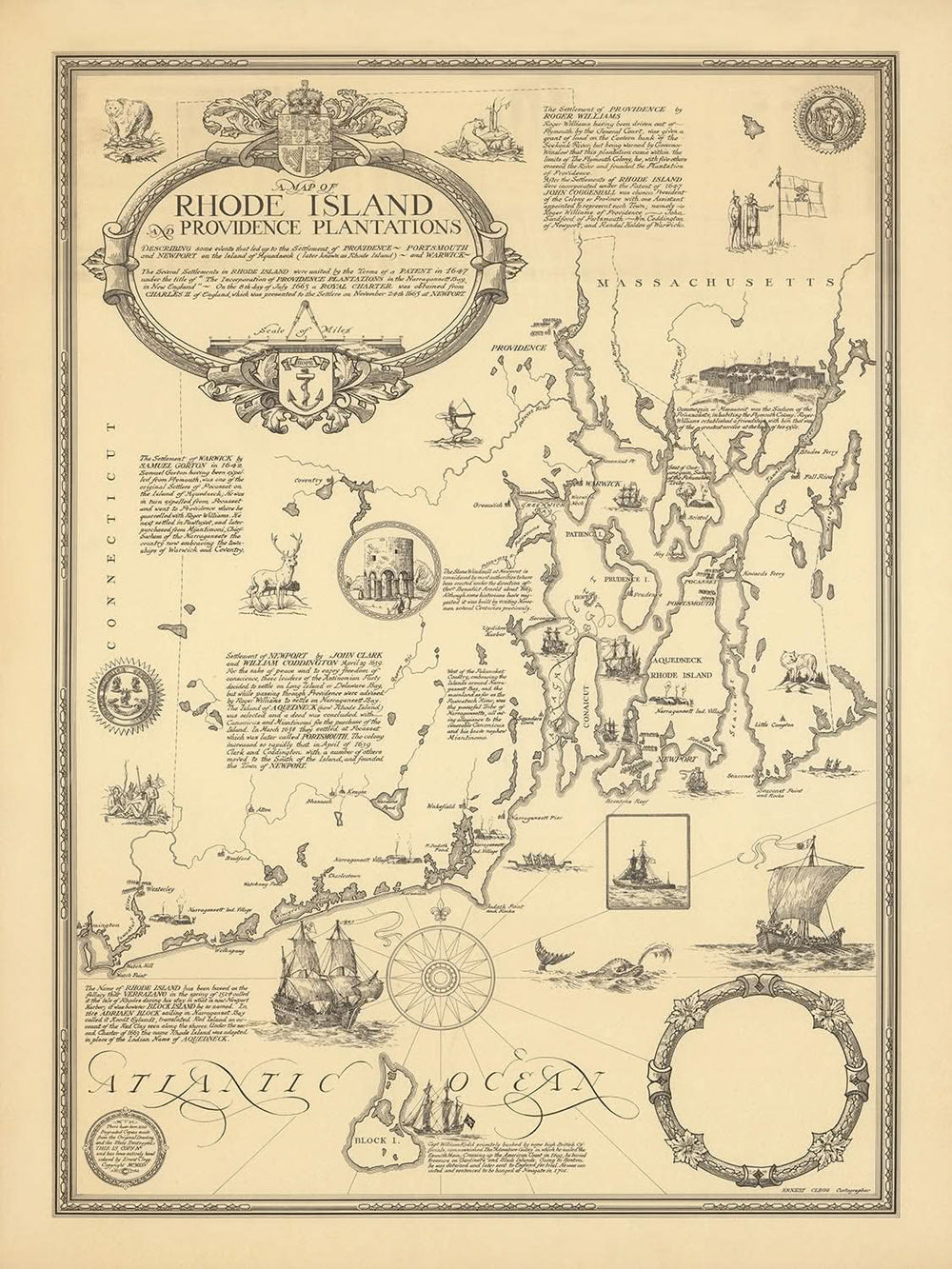 The map covers the entirety of Rhode Island, extending into parts of Massachusetts and Connecticut, with the Atlantic Ocean beautifully rendered along its eastern edge. It showcases the detailed coastline of Rhode Island, highlighting its bays, inlets, and islands. An inset map of Block Island adds depth to the geographical representation. The map’s thematic focus is evident in the inclusion of historical annotations and artistic depictions of Native American figures, colonial settlements, and early explorers, offering a window into the past.