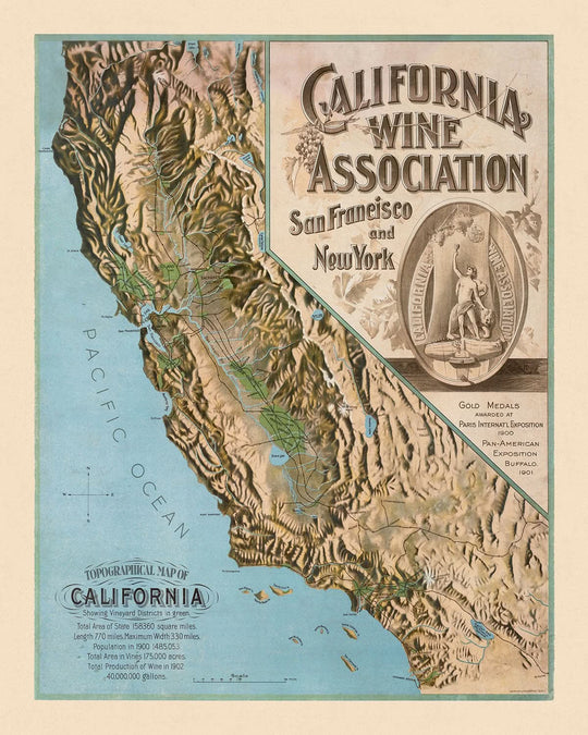 The California Wine Association, a powerhouse in the wine trade, played a pivotal role in the state's viticultural development. By controlling over 80% of wine production, the association not only influenced grape and wine prices but also established quality standards that stabilized the industry. This map, a promotional piece from the association, reflects their dominance and commitment to excellence, as evidenced by their accolades at the Paris International Exposition in 1900 and the Pan-American Exposition in 1901.