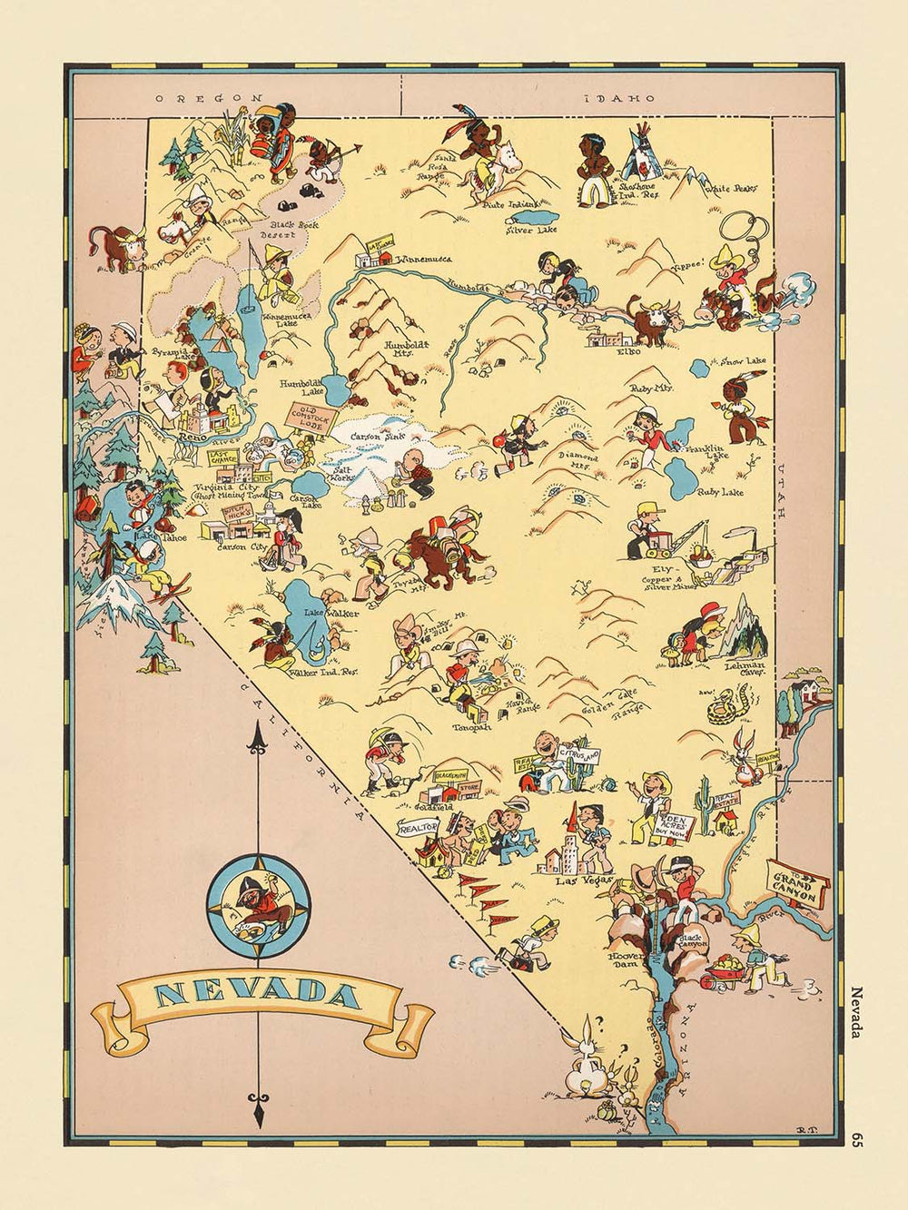Step into the vibrant world of 1930s America with “Nevada,” a captivating pictorial map originally crafted by Ruth Taylor White in 1935. This map is a brilliant example of the era’s fascination with whimsical, thematic cartography, blending vivid artistry with a playful approach to geography. Its original title, simply “Nevada,” signals a celebration of the Silver State’s unique character at a time when the West was both mythologized and rapidly changing. Designed as part of a renowned series of pictorial atlases, this map captures the essence of Nevada with a flair that is both informative and delightfully entertaining.