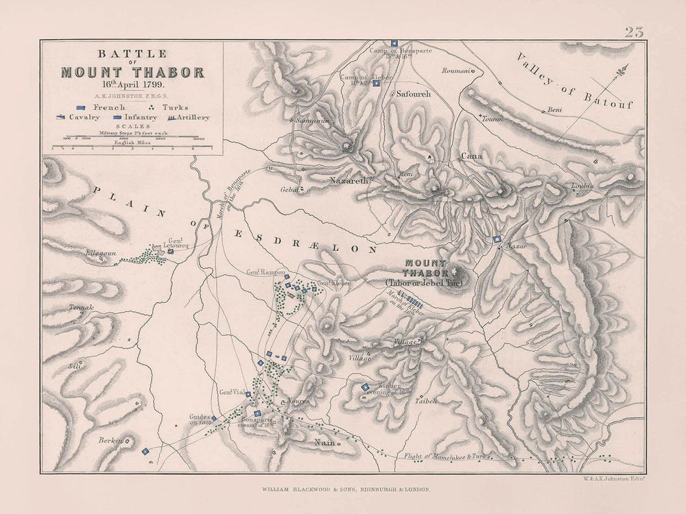 Introducing the detailed "Battle of Mount Thabor, 16 April 1799," a historic lithograph depicting the strategic maneuvers of French and Turkish forces engaging on this significant battlefield. Crafted by the esteemed AK Johnston in 1799, this antique hand-colored engravure beautifully captures the disposition of cavalry, infantry, and artillery, wrapped in the complexities of war etched into the historical landscape.