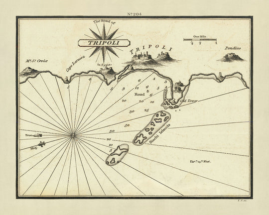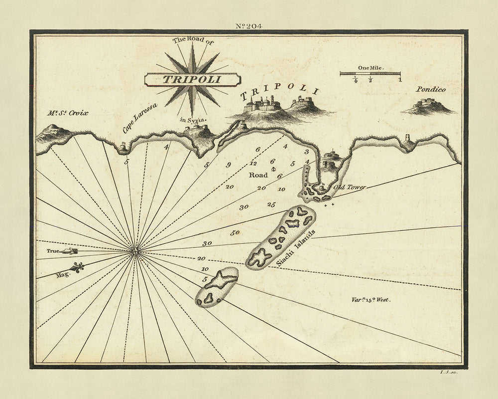 Heather's chart is a treasure trove of maritime knowledge, detailing soundings, navigational aids, and topographical nuances along the Tripoli coastline. The inclusion of various natural and man-made landmarks such as the Shachi Islands, the Old Tower, and several fortifications, enhances its utility and historical value. Each feature is finely engraved, a hallmark of Heather's commitment to precision and clarity in maritime cartography. This chart not only served as a critical tool for 19th-century navigators but now serves as a fascinating historical document for collectors and scholars alike.