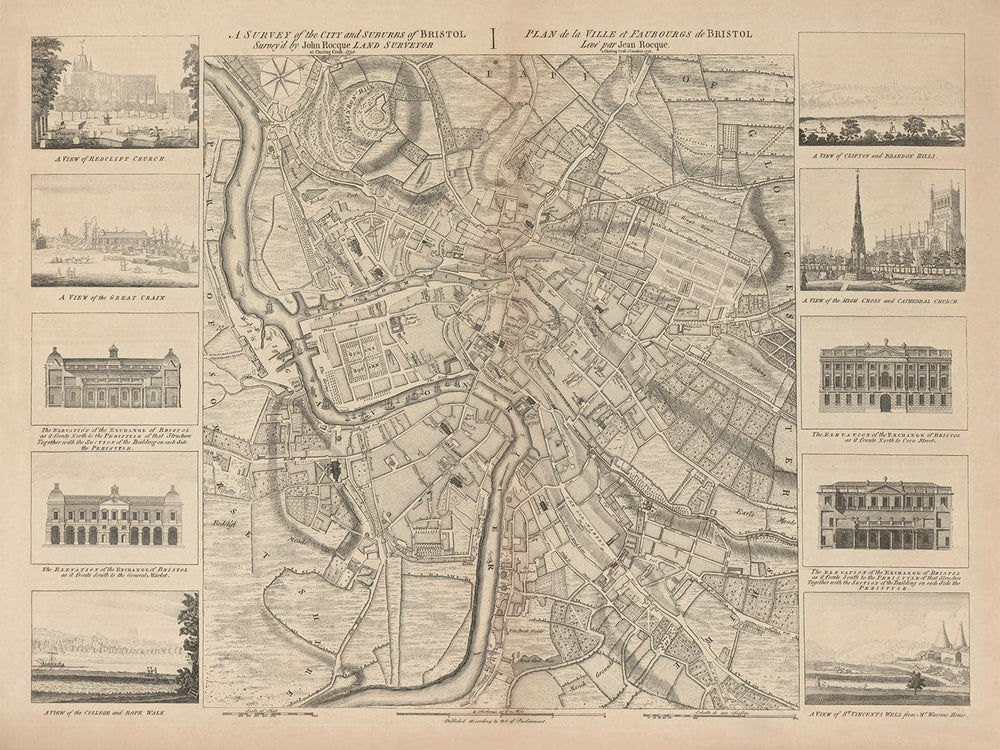This old map of Bristol in 1750 is another masterpiece created by John Rocque, who surveyed, drew and published this map.