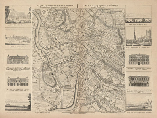 Around the edge of the map are 10 engravings of famous Bristol landmarks - or at least, they were important landmarks in 1750! This is a lovely map from a time when many of Bristol's historic streets had already been laid down, but the town itself was still quite small and rural. If you've ever wanted to see the Exchange of Bristol from all four elevations in 1750, this is the map for you.