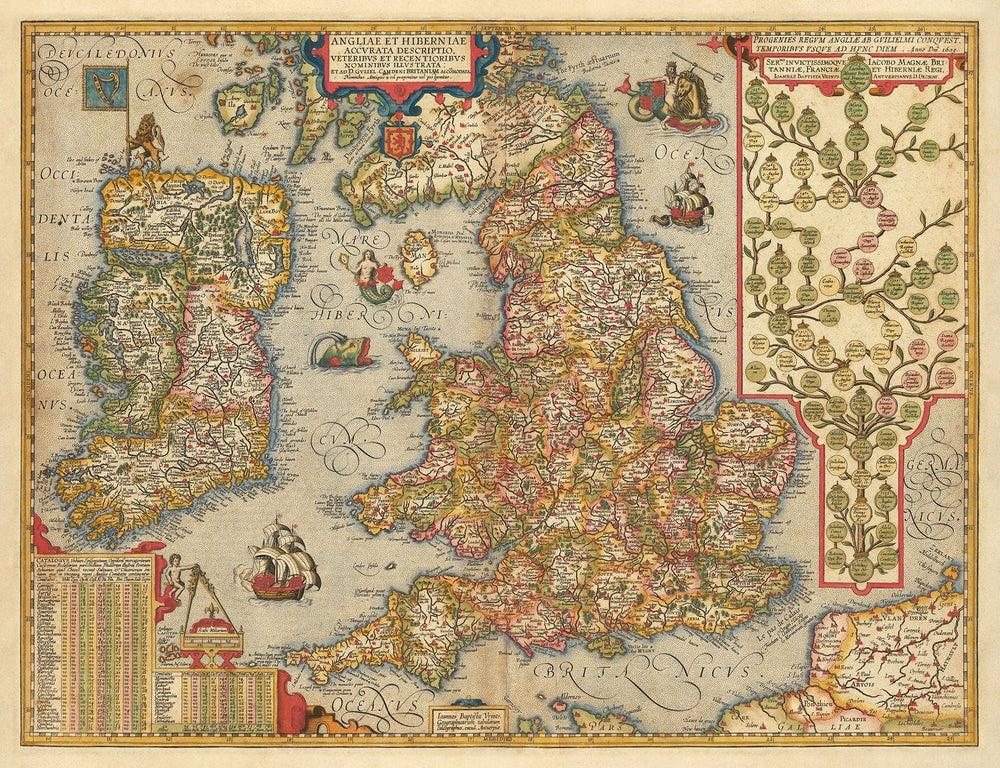 Old Colour Map of England & Ireland in 1605 by Abraham Ortelius: History & Monarchy Family Tree