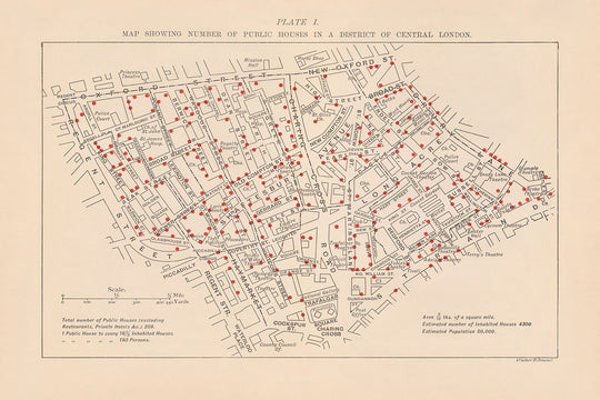 - The map provides a snapshot of the number of public houses in a district of central London in the late 19th century.