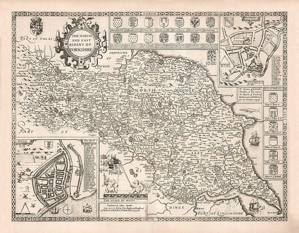 This old black and white/monochrome wonderful map shows the ancient counties of the North and East Ridings of Yorkshire as they were in 1611. It was created by John Speed and engraved by Jodocus Hondius, and originally published in Speed's "The Theatre of the Empire of Great Britaine".