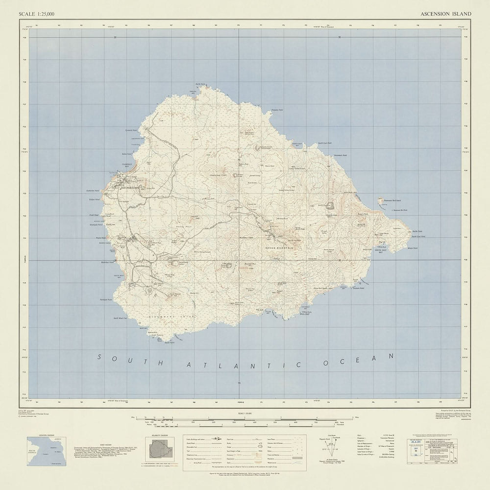 Step into the captivating world of cartography with the "Ascension Island Map," a masterpiece crafted by the esteemed British Overseas Surveys in 1964. This exquisite map captures the essence of Ascension Island, a remote jewel in the South Atlantic Ocean. Created in the distinguished Ordnance Survey style, it offers a detailed portrayal of the island's topography and infrastructure, providing a unique glimpse into the mid-20th century landscape of this British territory.