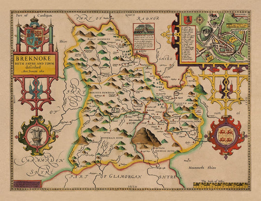 This old, full colour and exceedingly rare map shows the ancient county of Brecon (or Brecknockshire as it was known then), Wales in 1611. It was created by John Speed and engraved by Jodocus Hondius, and originally published in Speed's "The Theatre of the Empire of Great Britaine".